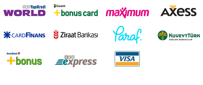 Axess, Maximum, Card Finans, Paraf, Denizbank, Bankakart Combo, Sağlam Kart, Albaraka, Miles&Smiles kredi kartlarına 8 aya varan taksit imkânı